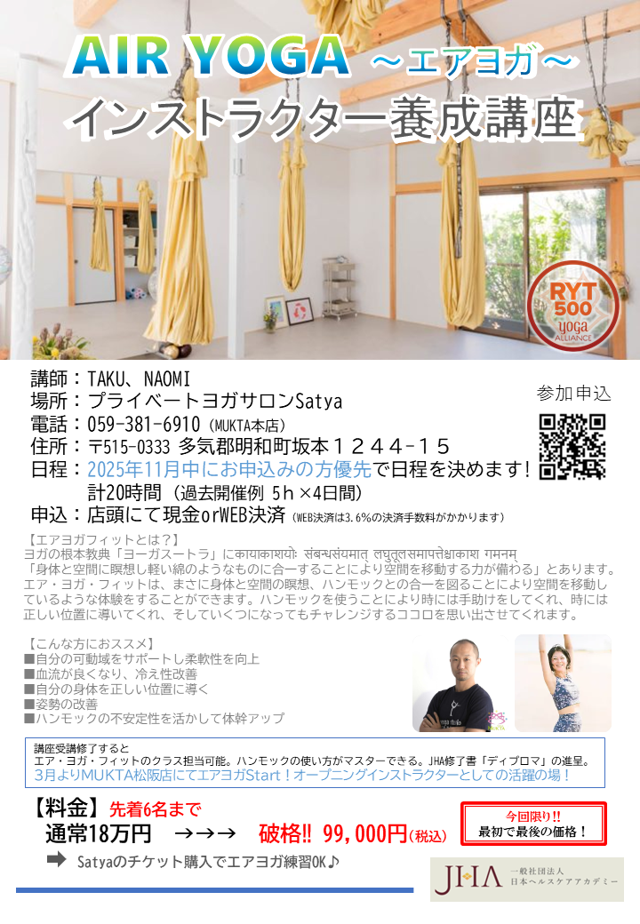 MUKTA松阪店エアヨガオープニングインストラクターの担当が可能!人気のハンモックを使ったヨガ。JHAオリジナルの内容でスタジオに導入できるか?の相談も受付中。